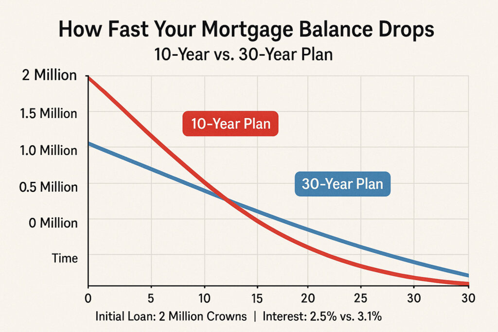 • Break-even Point: The 10-year mortgage borrower will have completely paid off their loan while the 30-year borrower will still owe about 1.4 million crowns at the 10-year mark.